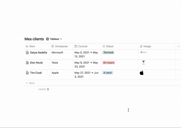 Vous pouvez également connecter vos bases de données entre elles pour les inclure dans différentes pages de votre espace de travail et les adapter à chaque usage particulier. Par exemple, vous pouvez créer une nouvelle base de données pour vos missions et inclure pour chaque mission un lien vers la page du client.