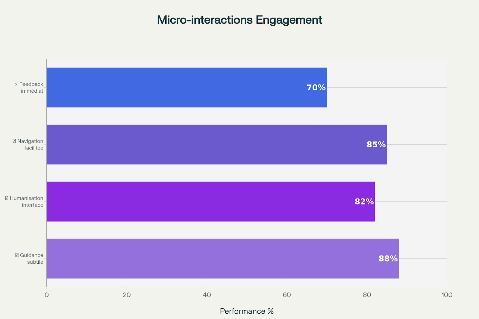 Les micro-interactions ne sont plus des « détails esthétiques » : ce sont les fondations de l’engagement moderne. Selon les données compilées dans le PDF, elles augmentent l’engagement utilisateur de 21 à 40 % et 46 % des utilisateurs déclarent qu’elles rendent leur navigation plus fluide et agréable.