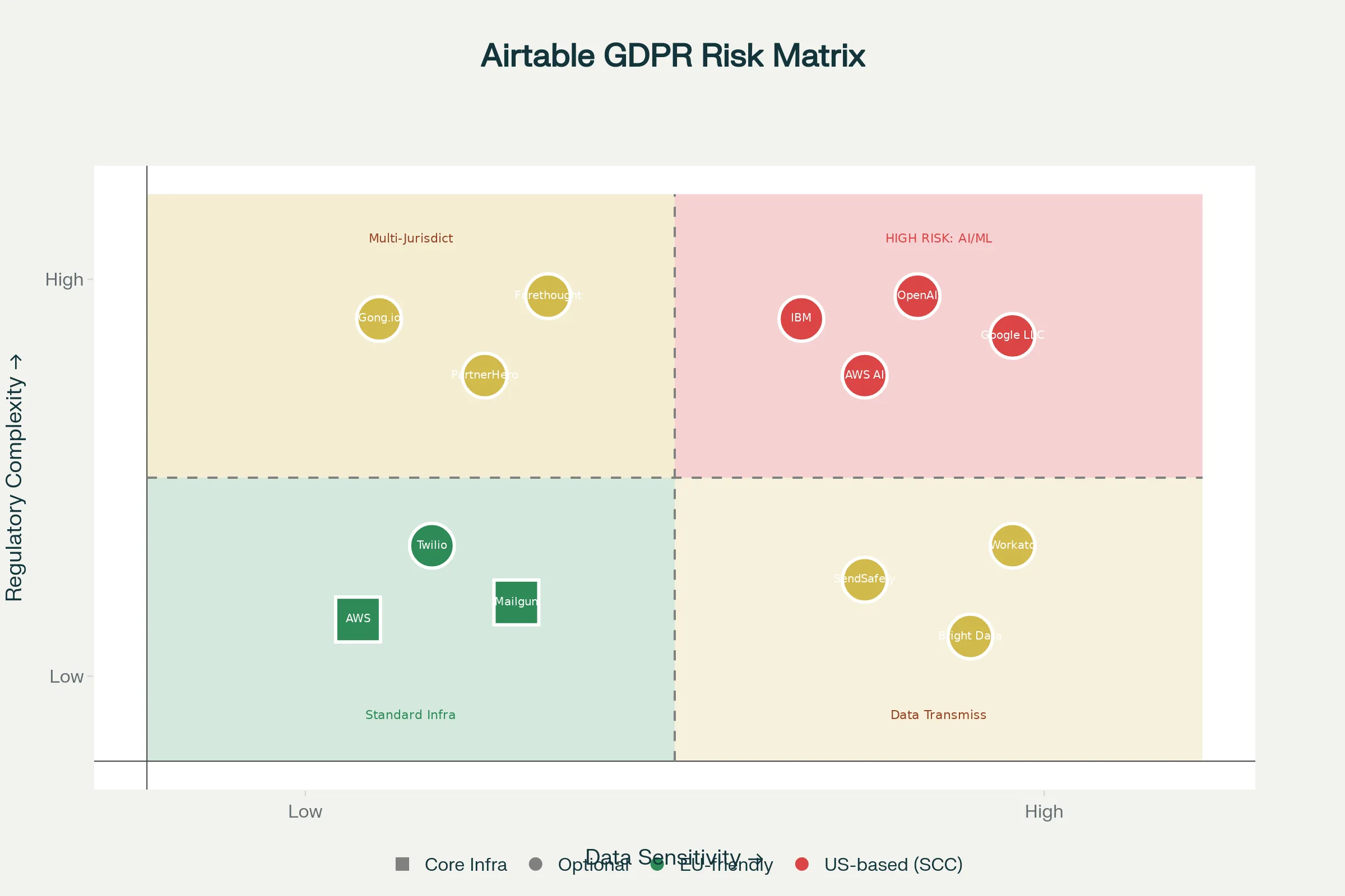 Les schémas présents dans la matrice montrent également une difficulté structurelle : Airtable repose sur des opérateurs situés dans plusieurs zones réglementaires différentes.
