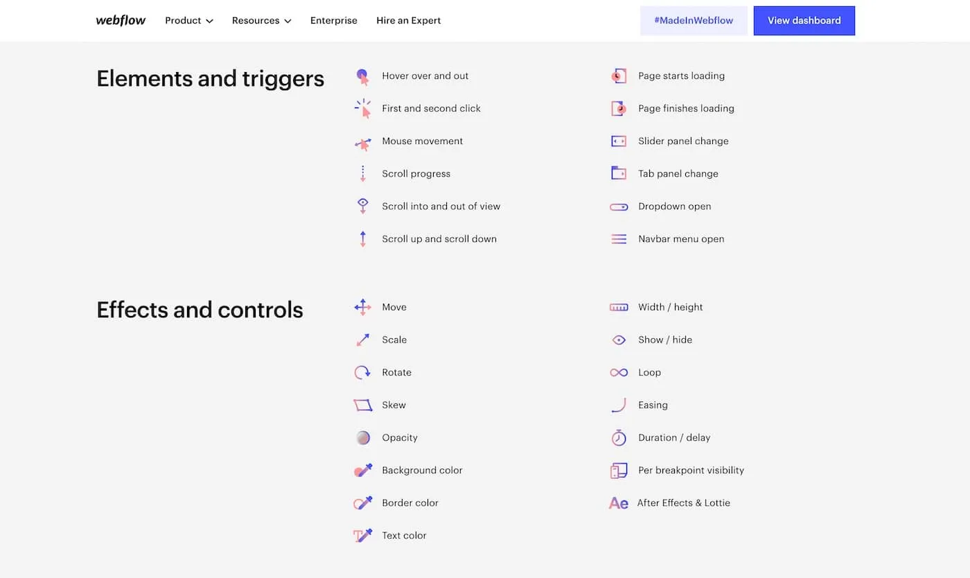Si vous avez prévu d'intégrer des animations, vous pourrez les concevoir directement dans sur vos pages. Webflow fait partie des meilleurs outils de conception d'interactions disponibles. Par conséquent, il n'est pas nécessaire de créer des interactions dans d'autres programmes.