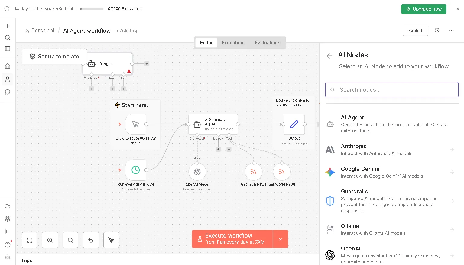 - Agent natif : nœud AI Agent avec mémoire et outils intégrés.
